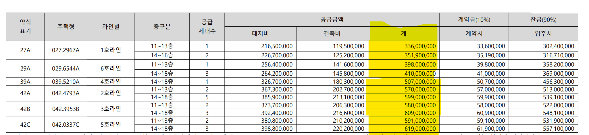 | 42C | 5 | 5억9100만원 ~ 6억1900만원 |