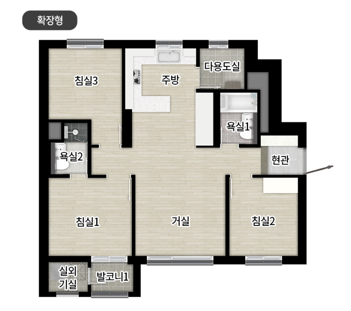 3 베이 판상형 구조가 기본이며, 방 3개, 화장실 2개 구조가 주를 이룹니다. 일부 타입은 알파룸 또는 분리 세대 구조(현관 2개, 부엌과 욕실 추가)로 다양하게 설계되어 노부모 동거나 임대 활용 등 다양한 라이프스타일에 대응 가능합니다. - 발코니 확장비