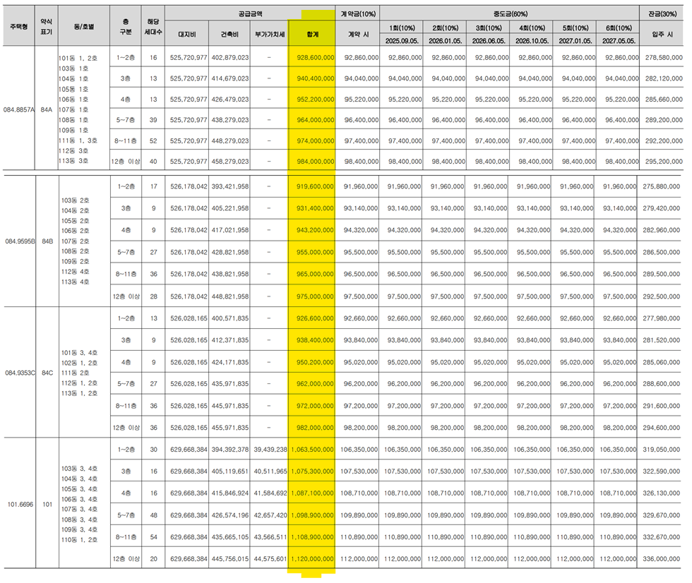 - 전용면적 84㎡(A, B, C형)와 101㎡로 구성되어 있으며, 총 613 가구 중 대부분이 일반 분양 물량이다.