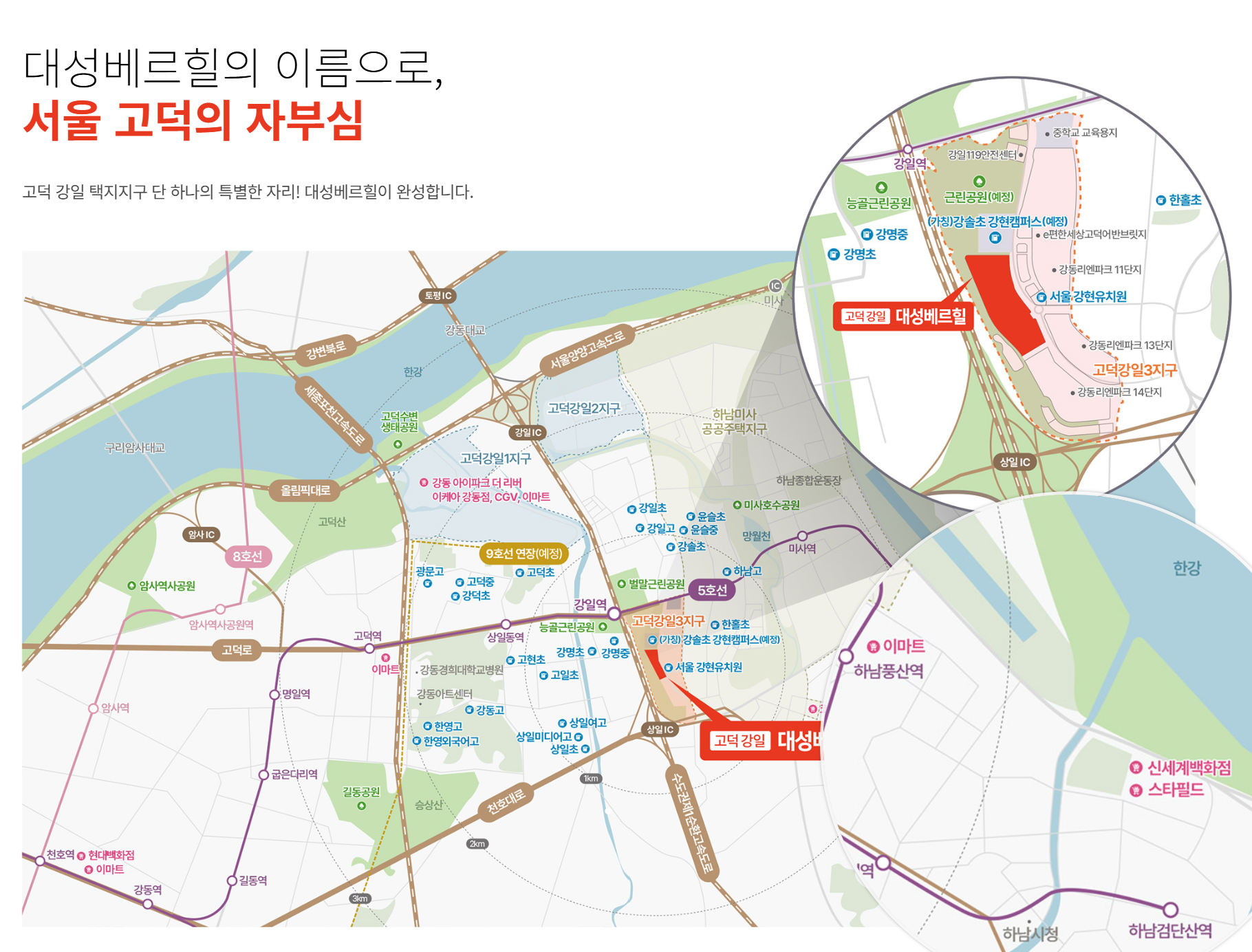 - 서울 지하철 5호선 강일역이 도보권에 있어 역세권 단지로, 여의도역, 광화문역, 마곡역 등 서울 주요 도심으로 환승 없이 편리하게 이동할 수 있다.
