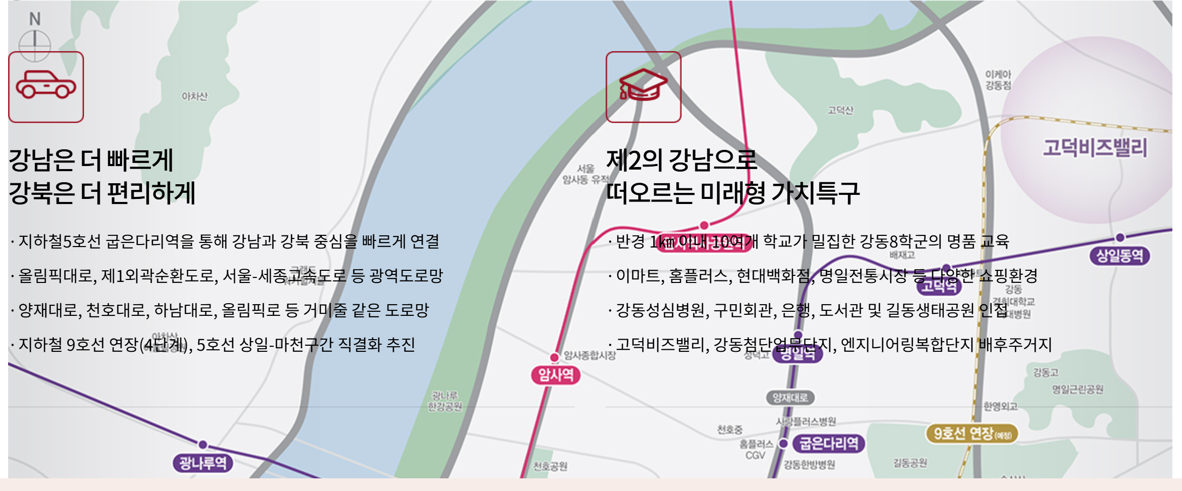 - 우수한 교통 접근성: 강동 디아테온은 지하철과 버스 등 대중교통이 잘 연결되어 있어 서울 도심 및 인근 지역으로의 이동이 편리합니다.