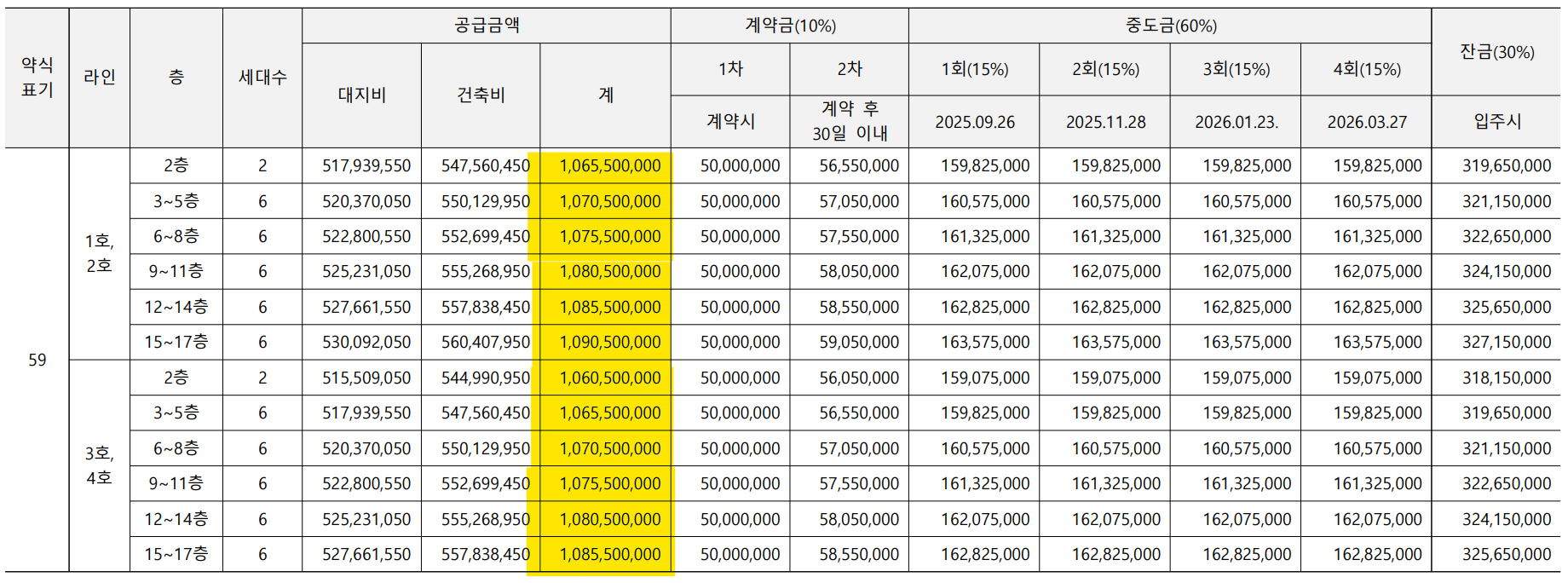 | 59 | 64 | 10억6550만원 ~ 10억9050만원 | 1호, 2호 |