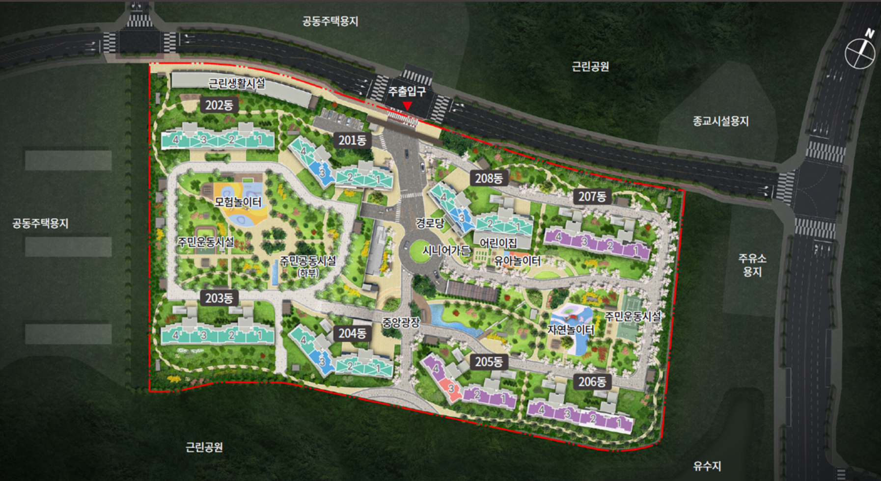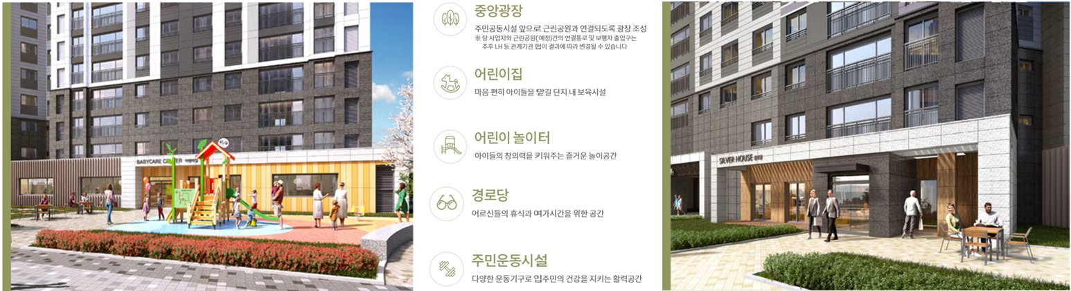- 쾌적한 주거환경: 단지 앞뒤로 근린공원이 예정되어 있어 자연 친화적이며, 시야를 가리는 고층 건물이 없어 공원 뷰를 누릴 수 있다.