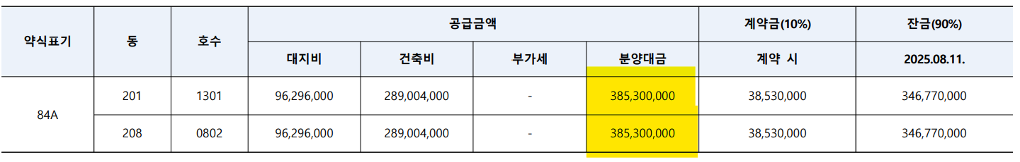 | 면적 | 세대수 | 가격 | 동호수 |