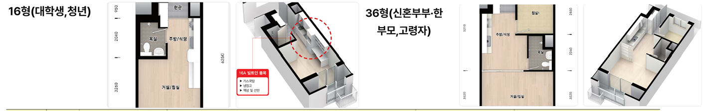 16형과 26형은 원룸형 구조로 주방/식당과 거실/침실이 일체형이며, 36형은 침실과 거실/주방이 미닫이문으로 분리된 2 베이 구조입니다.