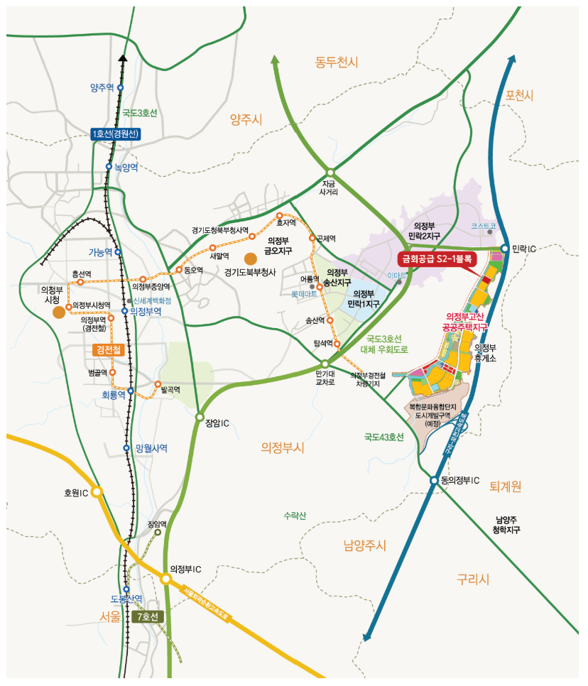 - 경기도 의정부시 입암로 14, 고산동 173번지 일대 의정부고산 S2-1블록에 위치해 서울 도심까지 직선거리 약 25km로 접근성이 좋습니다.