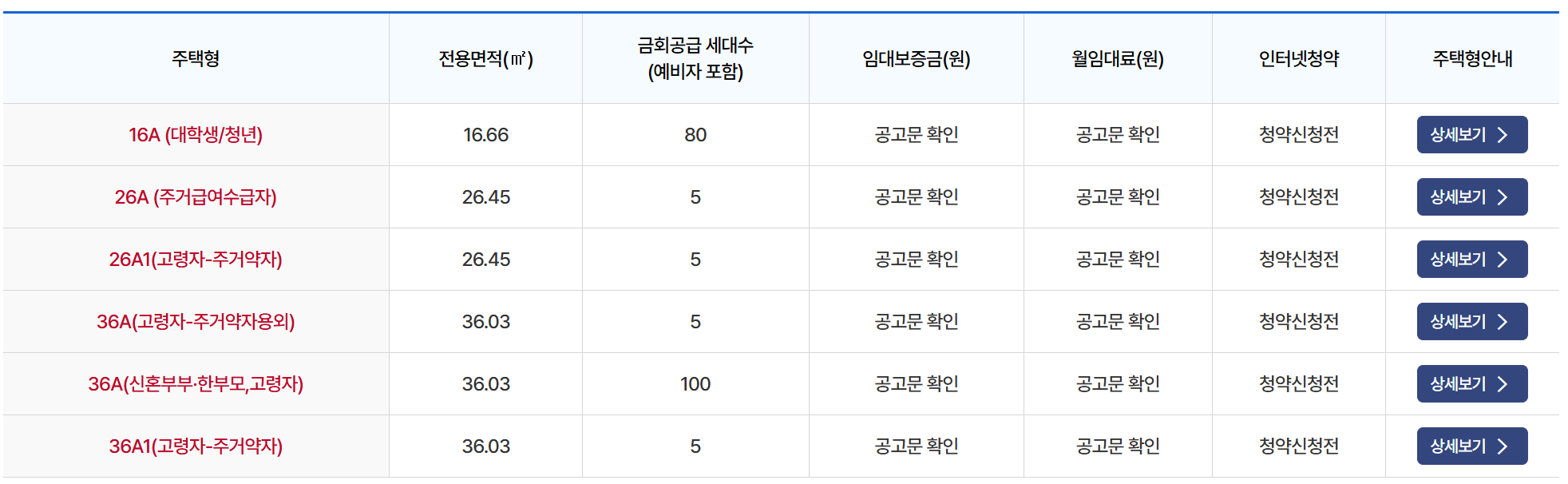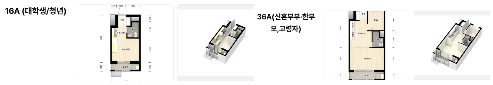 - 2개 동, 총 500세대 규모로 전용면적 16㎡, 26㎡, 36㎡ 3가지 타입으로 구성되어 있습니다.
