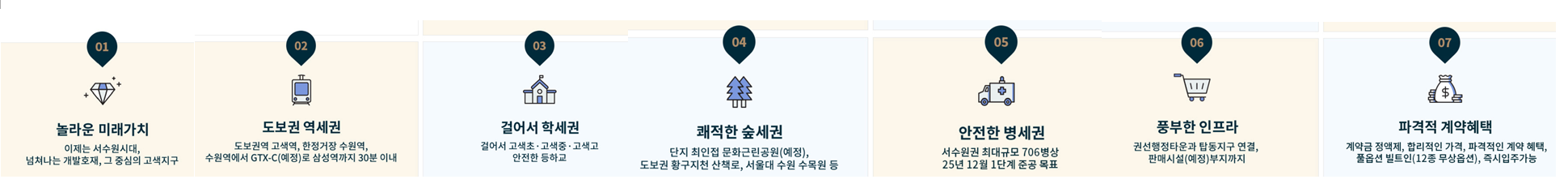 권선구청, 보건소, 경찰서 등 공공기관과 대형 쇼핑몰, 극장 등 문화시설이 가까워 생활 편의성이 뛰어납니다. 또한 706병상 규모의 대형 종합병원인 덕산병원이 2024년 10월 개원 예정으로 수준 높은 의료 서비스를 이용할 수 있습니다. - 미래 가치와 개발 호재