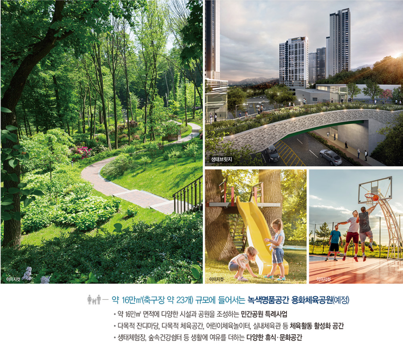 - 민간공원 특례사업 단지로, 아산시 최초로 도입된 민간공원 조성사업에 따라 용화체육공원과 연계된 친환경 주거 환경을 제공합니다. 단지 내 산책로가 공원과 연결되어 쾌적한 녹지 공간을 누릴 수 있습니다.