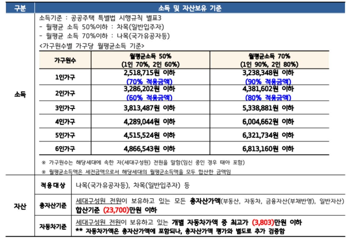 - 소득 및 자산 보유 기준: 영구임대주택 관련 소득 및 자산 기준을 충족해야 하며, 자세한 기준은 모집공고문 참고