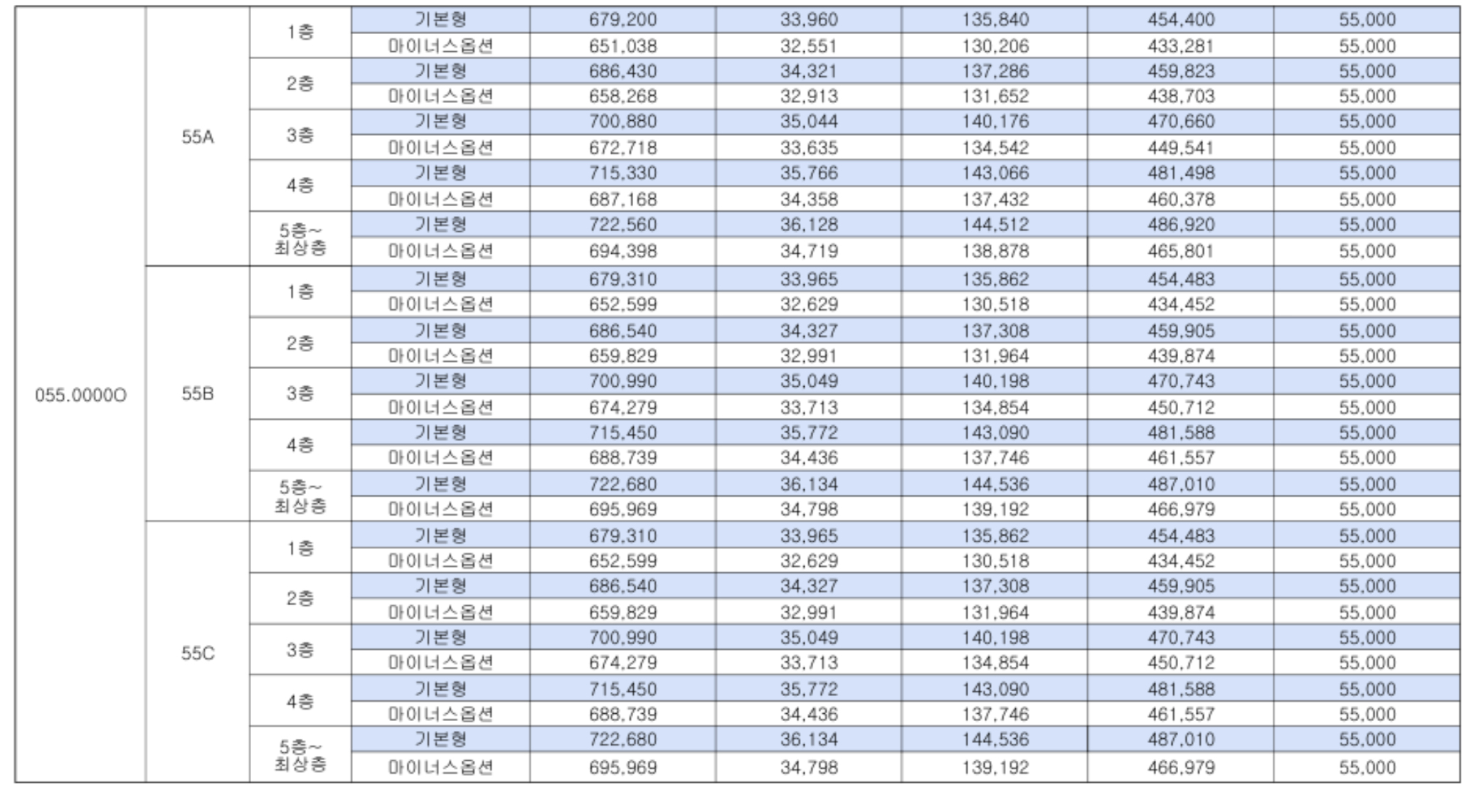 - 전용 55㎡: 약 6억 7천만 ~ 7억 2천만 원대