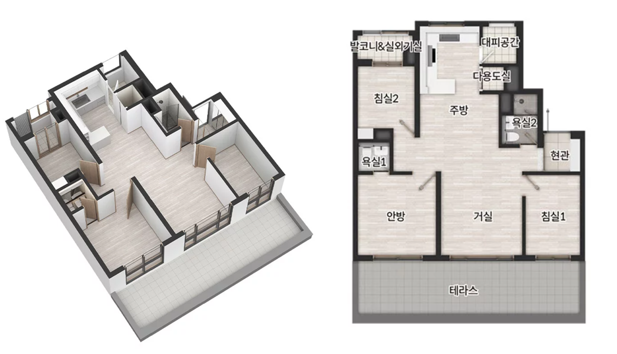 잔여세대 18세대가 이번 무순위청약의 대상인데요, 일반형, 테라스형 그리고 펜트하우스형 3 타입으로 나누어지며 모든 가구는 거실, 주방, 침실(3개), 화장실 (2개)로 구성된 판상형 설계입니다.