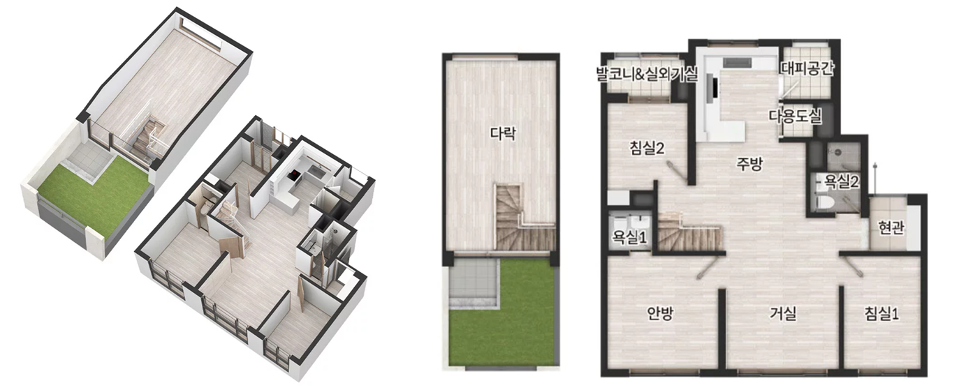 복층으로 확장된 공간의 레이어와 나만의 자연이 펼쳐질 개인정원을 갖춘 세대입니다.