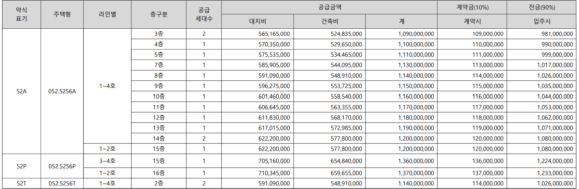| 일반형 (52A) | 10억9천만원~ 12억원 |