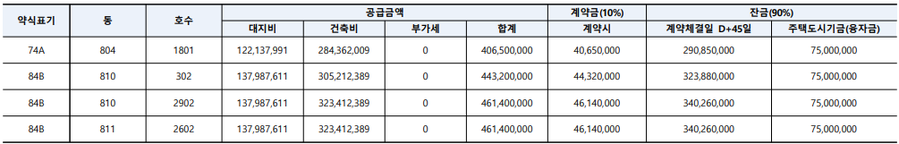 | 면적 | 세대수 | 가격 | 동호수 |
