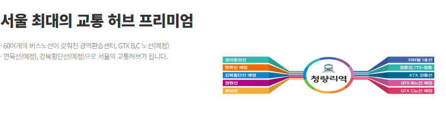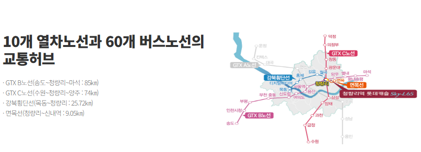 - 교통: 지하철 1호선·경의중앙선·수인분당선·KTX강릉선 등 기존 6개 노선에 향후 GTX-B·C, 면목선, 강북횡단선 등 추가 노선까지 예정돼 강력한 광역교통망이 가장 큰 장점으로 꼽힙니다.