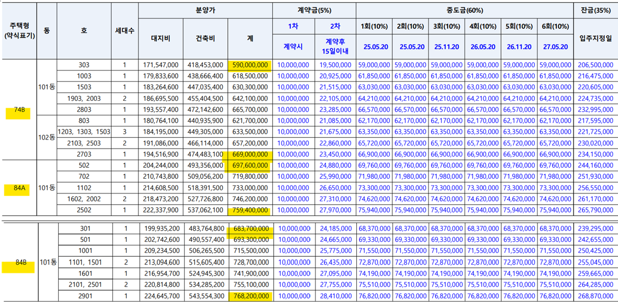 74B : 13세대 5억 9천만 원 ~ 6억 6600만 원