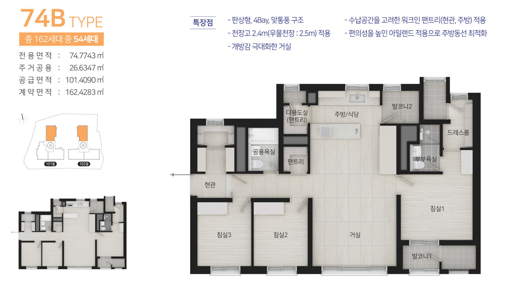 - 면적 : 전용 면적 74m², 84m²의 4 베이 판상형 구조
