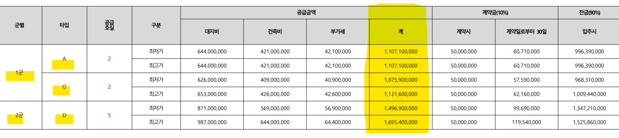- 1군 : G타입 - 2실, ,45.62 ㎡ , / 10억 7590만 원 ~ 11억 2160만 원