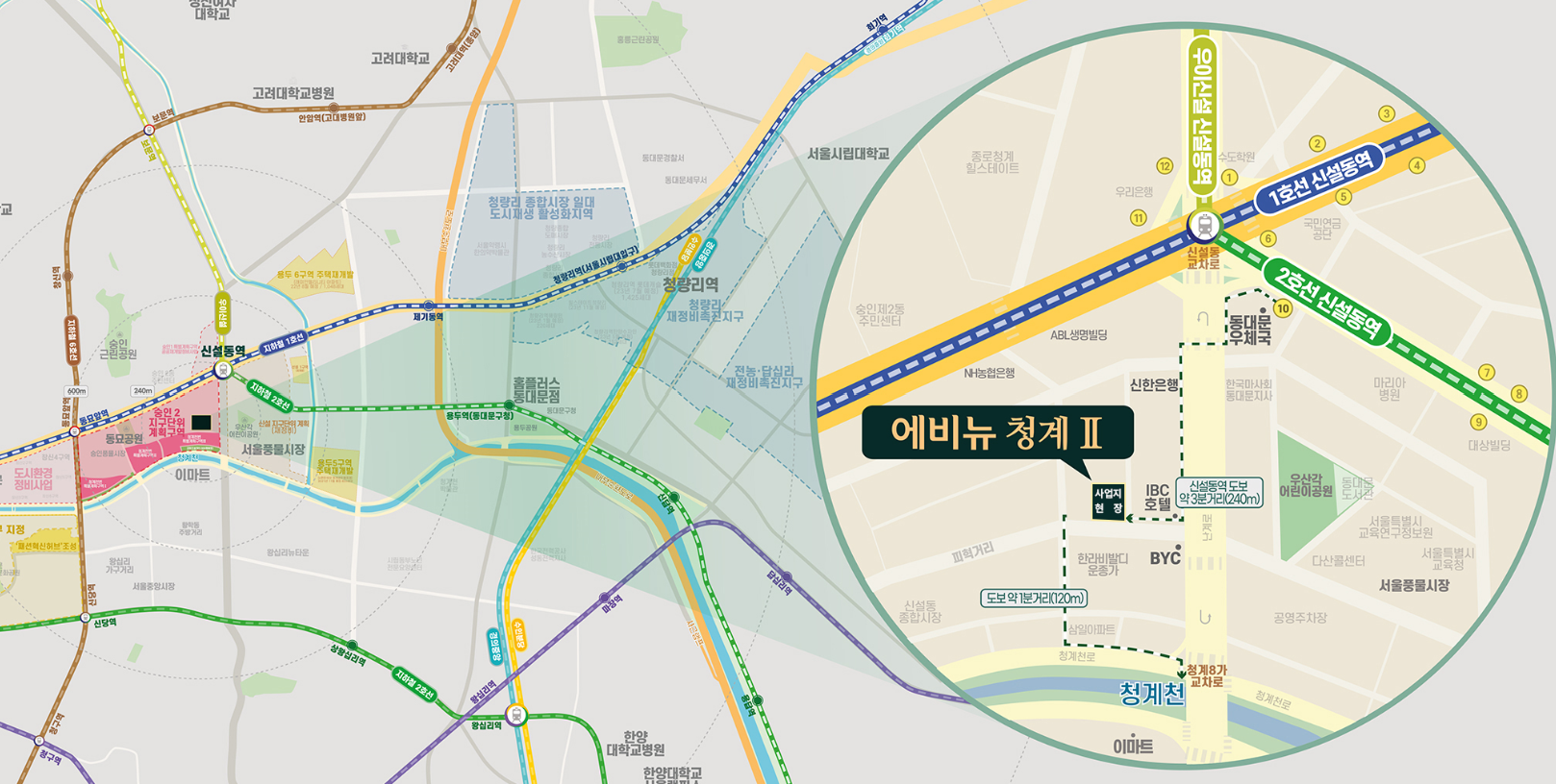 - 교통: 신설동역(1호선, 2호선, 우이신설선)에서 도보로 5분 거리에 위치해 지하철 환승 없이 서울 주요 권역으로 30분 내 이동이 가능합니다.