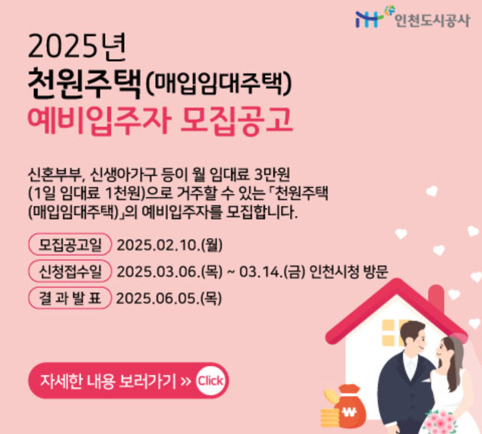 하루 1,000원의 임대료, 즉 한 달 3만 원이라는 파격적인 공공임대정책이 시작되었습니다.바로 인천에서 신혼부부와 신생아가구를 위해 인천도시공사에서 매입한 주택을 파격적인 조건으로 이용