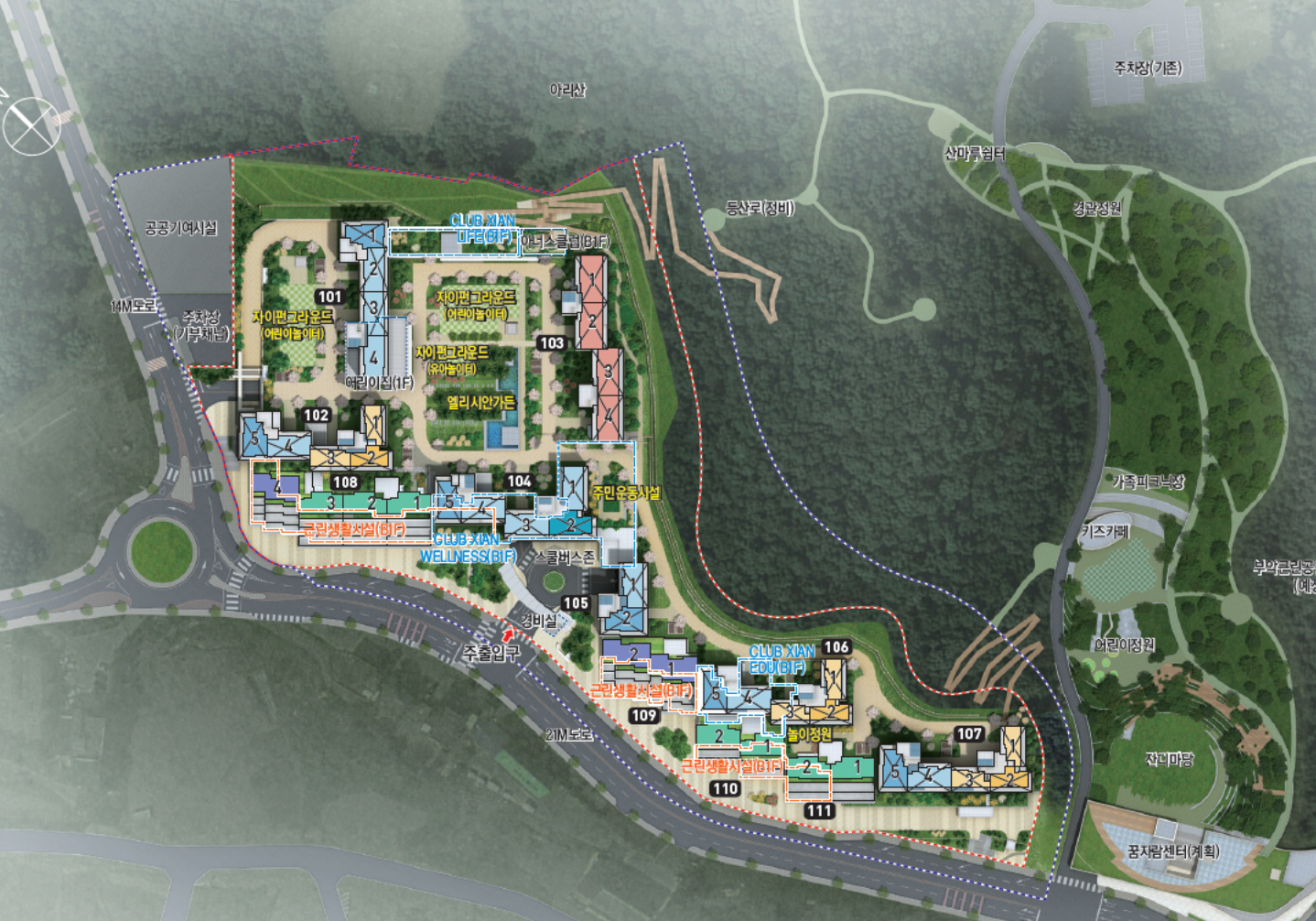 2. 민간공원 특례사업: 부악공원 내에 위치하며, 공원 면적이 전체 면적의 약 70%입니다. 축구장 약 18배 크기의 공원시설이 조성됩니다.