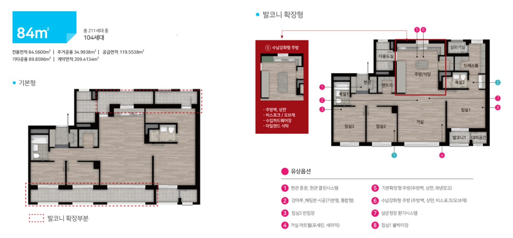 - 주거 공간: 알파룸, 두 개의 드레스룸, 광폭 거실 등 다양한 실사용 공간을 제공합니다. 침실 2, 3의 가변형 벽체와 대형 팬트리가 공간 활용도를 높입니다.
