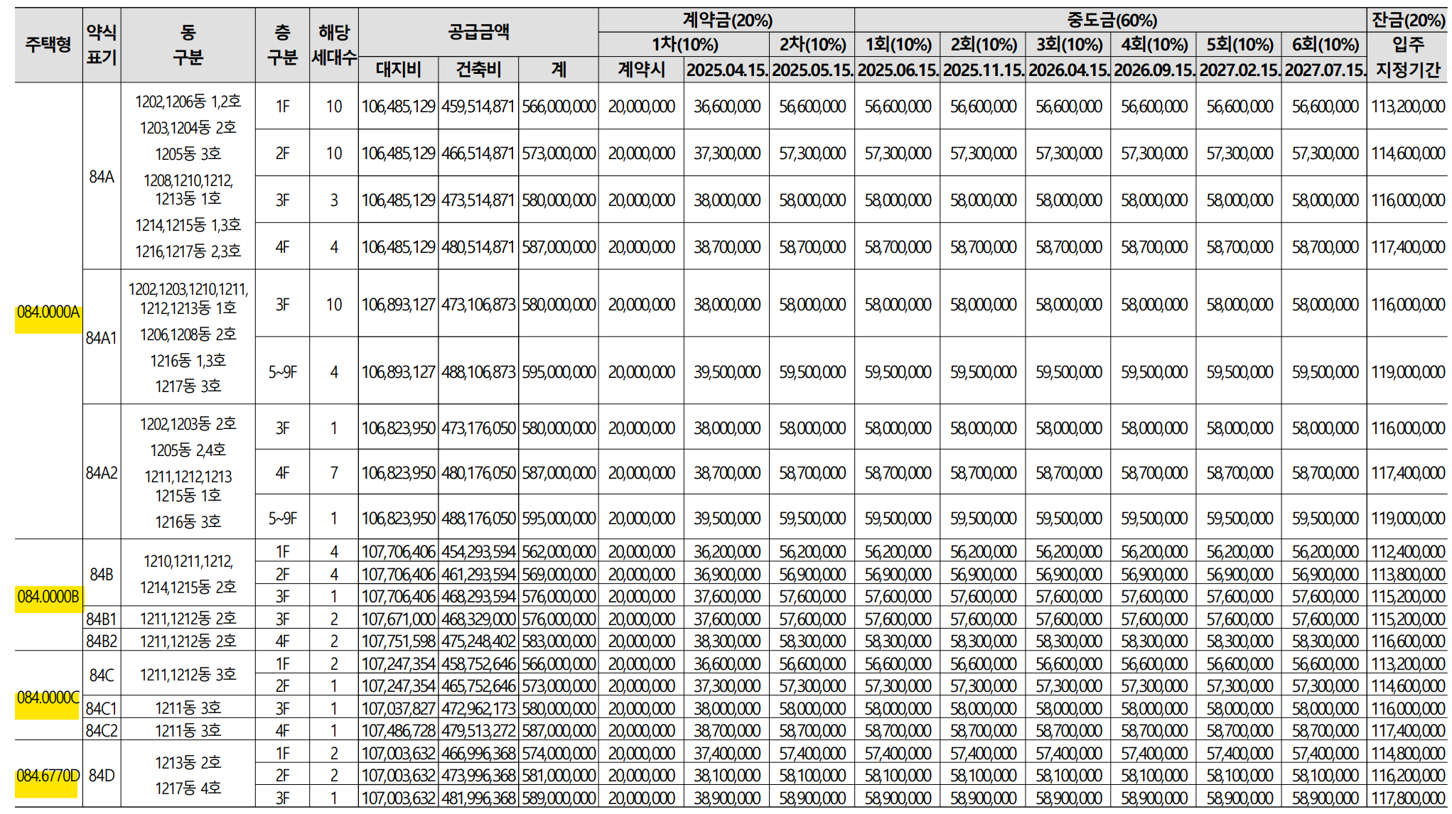 | 84B | 9 | 5억6200만원 ~ 5억8300만원 |