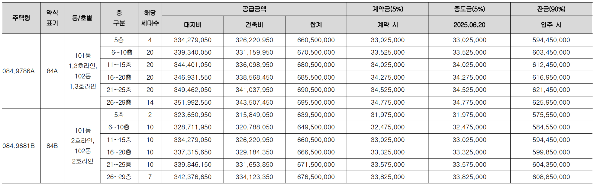 | 84A | 98 | 6억6050만원 ~ 6억9050만원 |