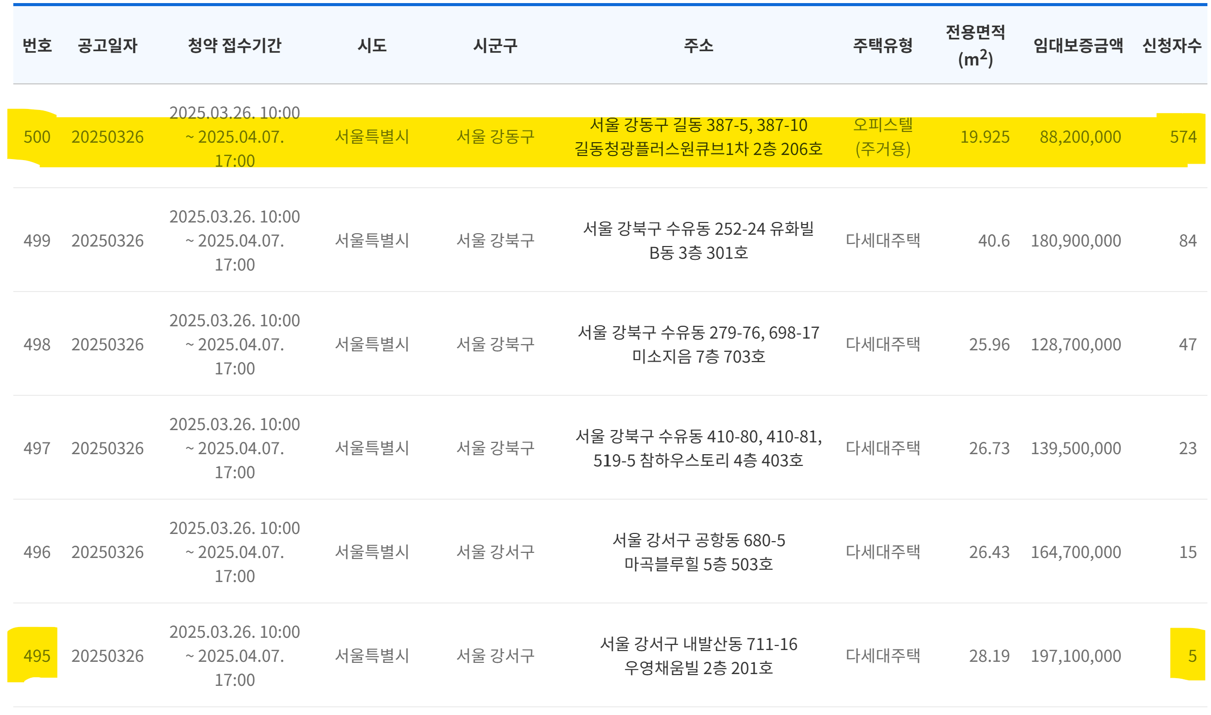 - 임대보증금은 각 물건마다 다르고, 500번의 서울강동구 물건을 예로 들면 임대보증금은 88,200,000원, 신청자는 현재시점으로 574건인 것을 알 수 있습니다.