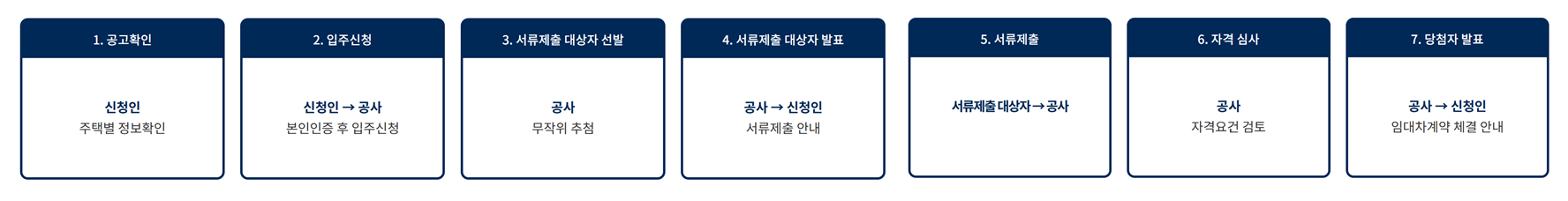 - 입주대상자로 선정된 자는 계약 시까지 입주자격을 유지하여야 하므로 계약 이전에 주택을 소유하게 되었다면 계약체결 및 입주가 불가합니다.