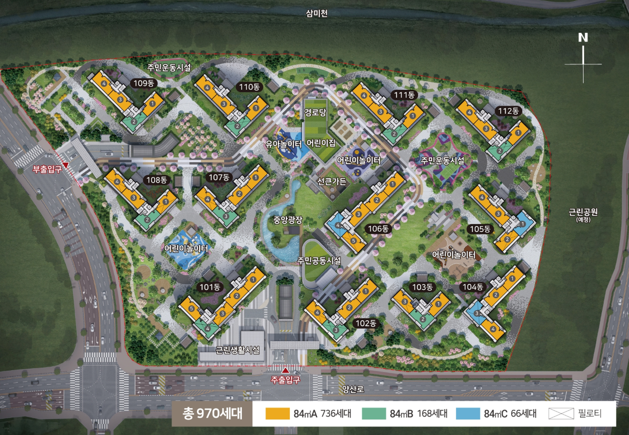 - 세대수 및 타입: 총 970세대로, 전용면적 84㎡ 단일형으로 A, B, C 타입으로 나뉘며, A타입이 736세대로 가장 많습니다.