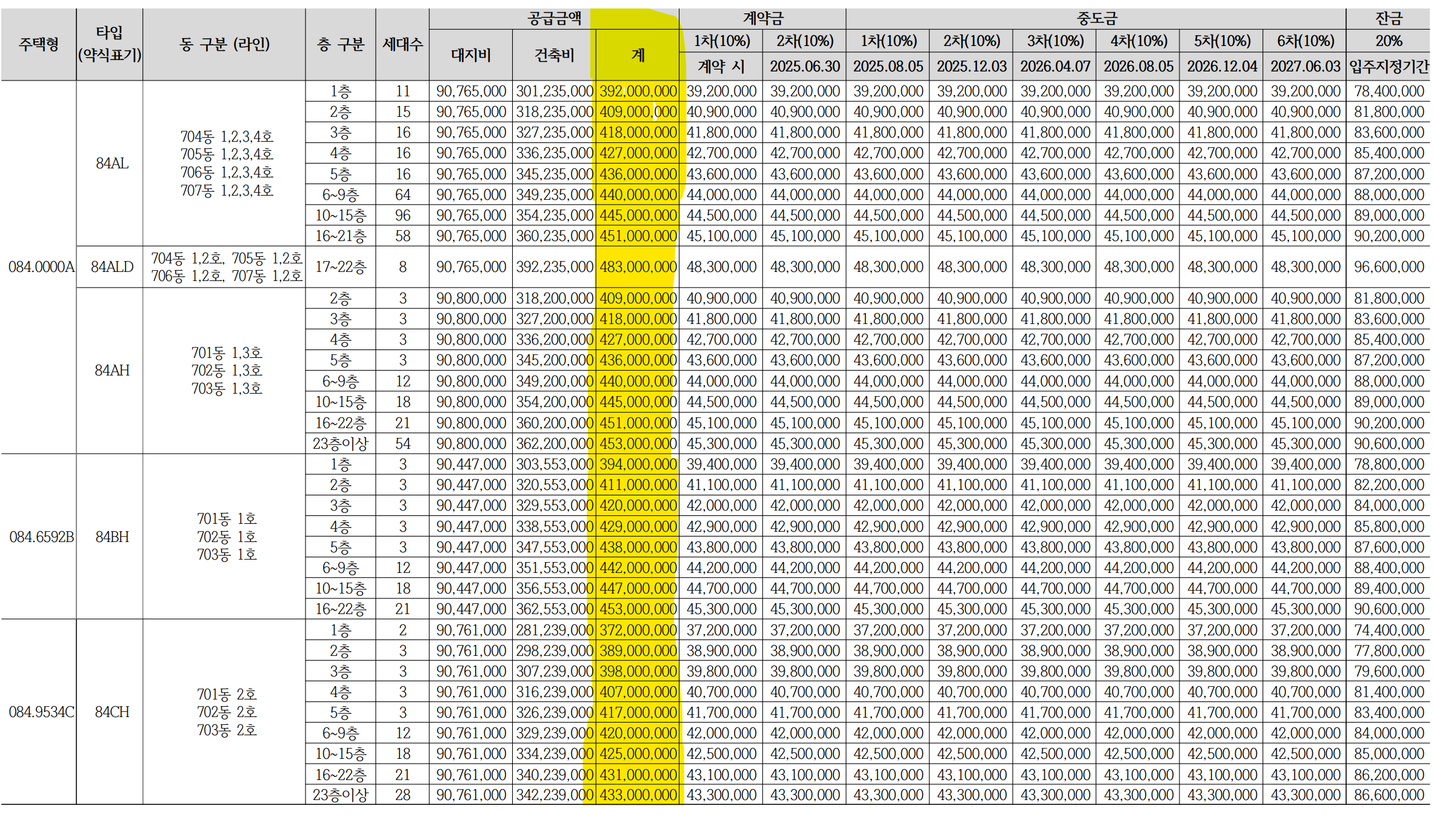 | 84BH | 66 | 3억9400만원 ~ 4억5300만원 |