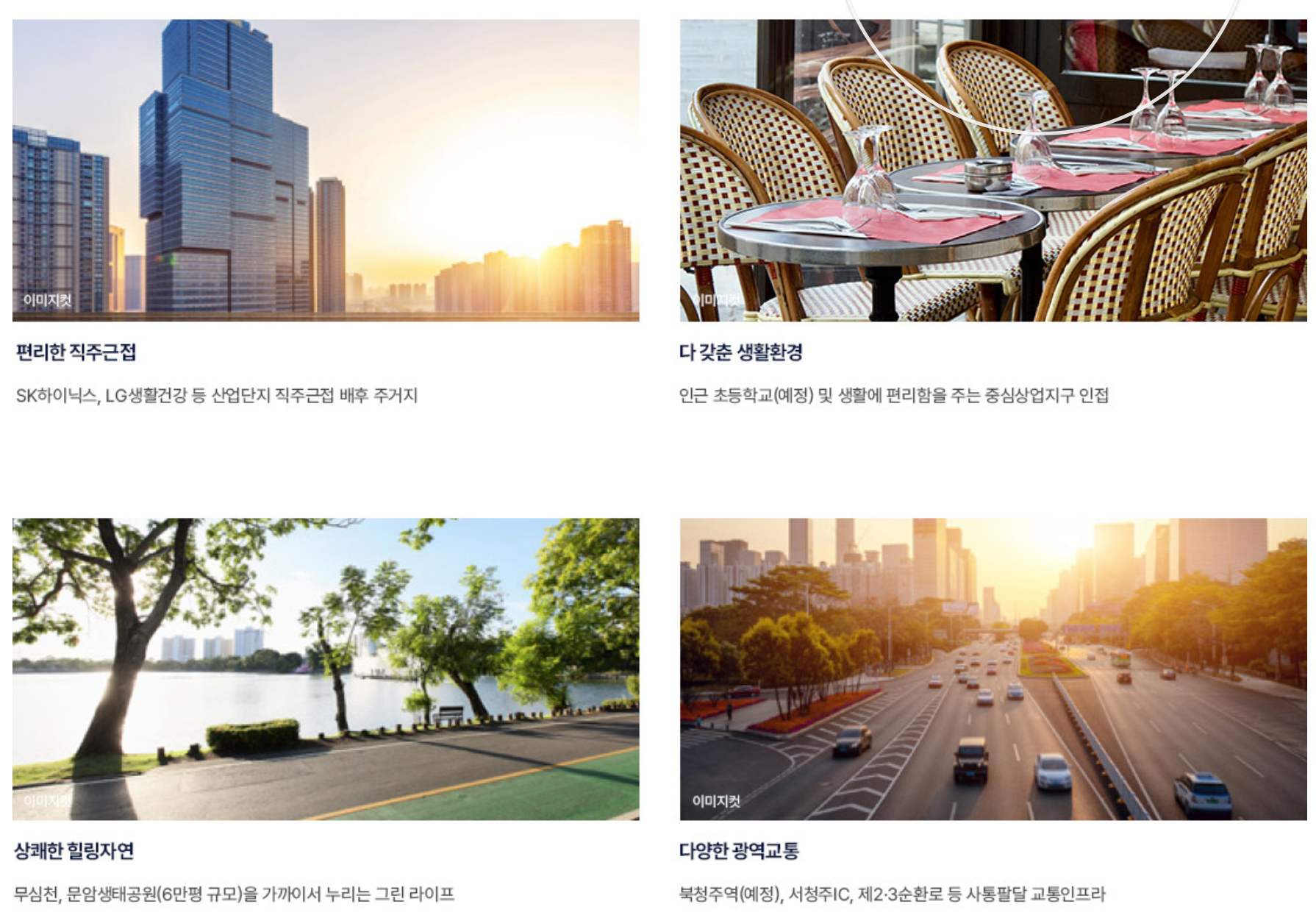 - 자연환경: 무심천과 문암생태공원 등 쾌적한 녹지 환경을 제공합니다.