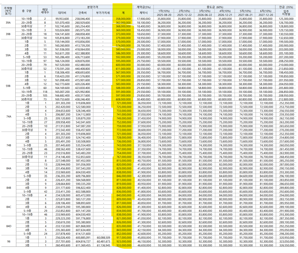 | 39A, 39B | 52 | 3억5800만원 ~ 3억7900만원 |