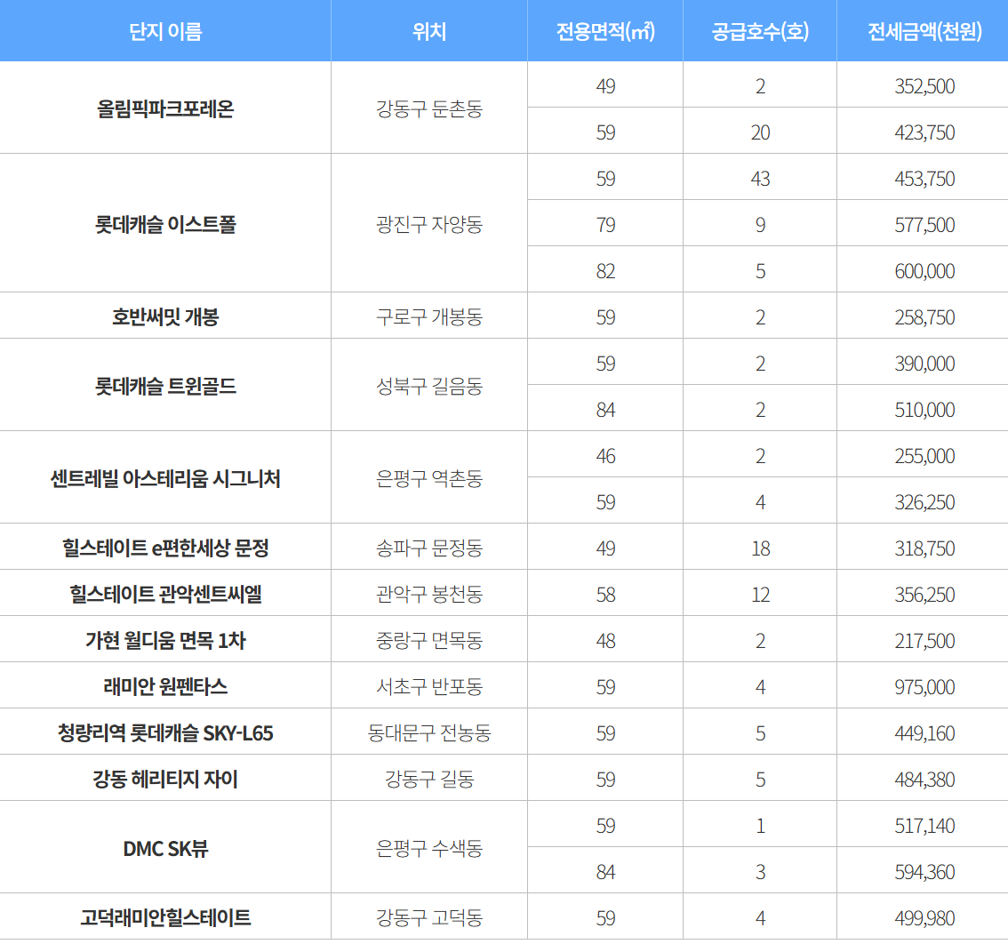 - 전세금: 최저 약 2억 1,700만 원(중랑구 48㎡)부터 최고 약 9억 7,500만 원(서초구 59㎡)까지 다양