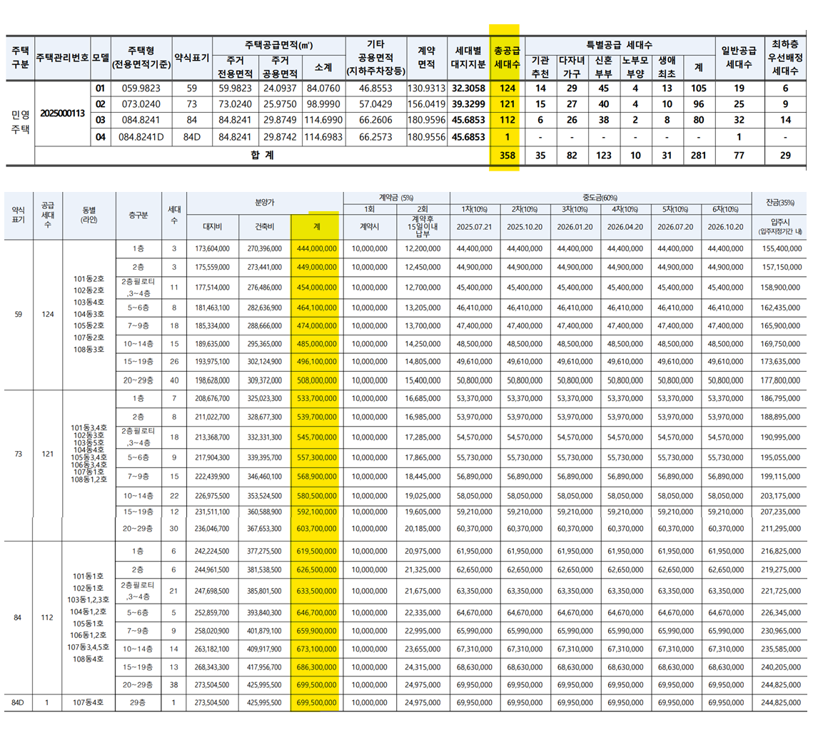 - 전용면적은 59㎡, 72㎡, 73㎡, 84㎡(A, B, C, D 타입) 등 중소형 평형 중심으로 실수요자들에게 적합합니다.