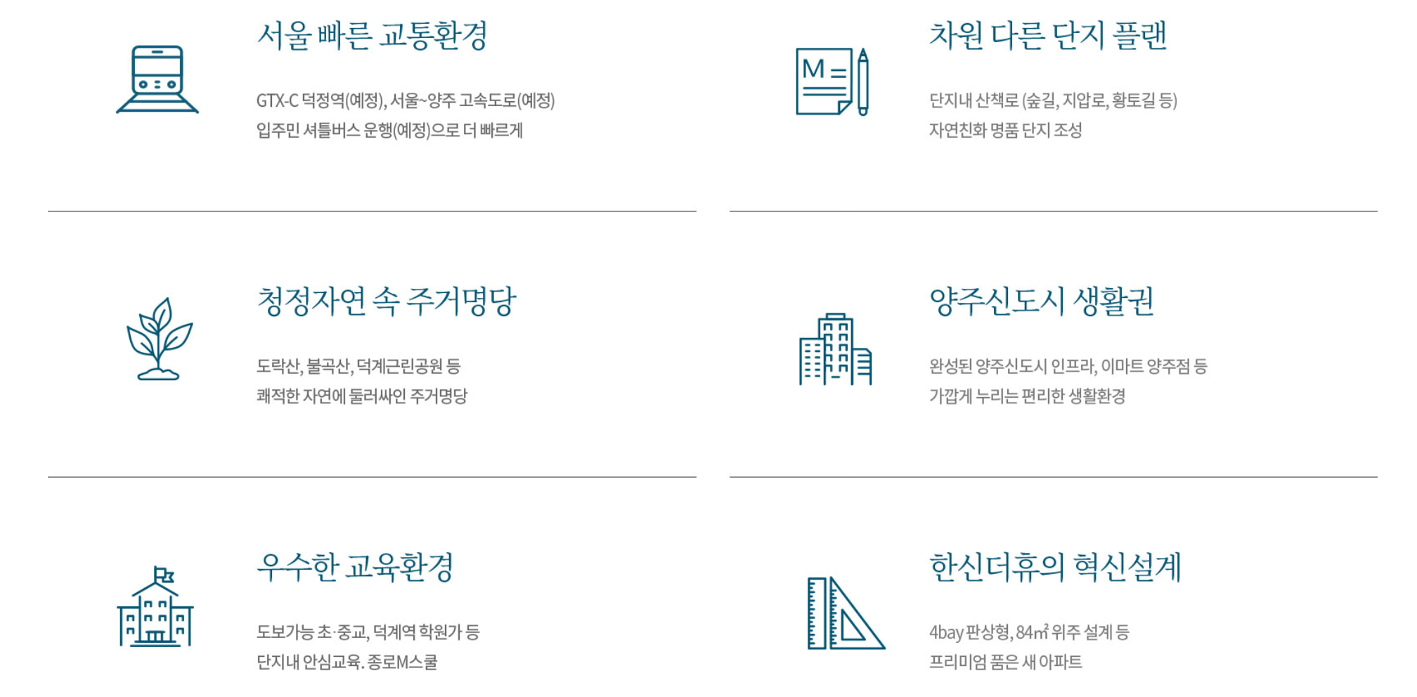 - GTX-C 노선(계획)과 환승이 용이하며, 평화로, 3번 국도, 서울~양주 고속도로(계획), 수도권 제2순환고속도로 등 주요 도로망과 가까워 서울 및 수도권 접근성이 뛰어납니다.