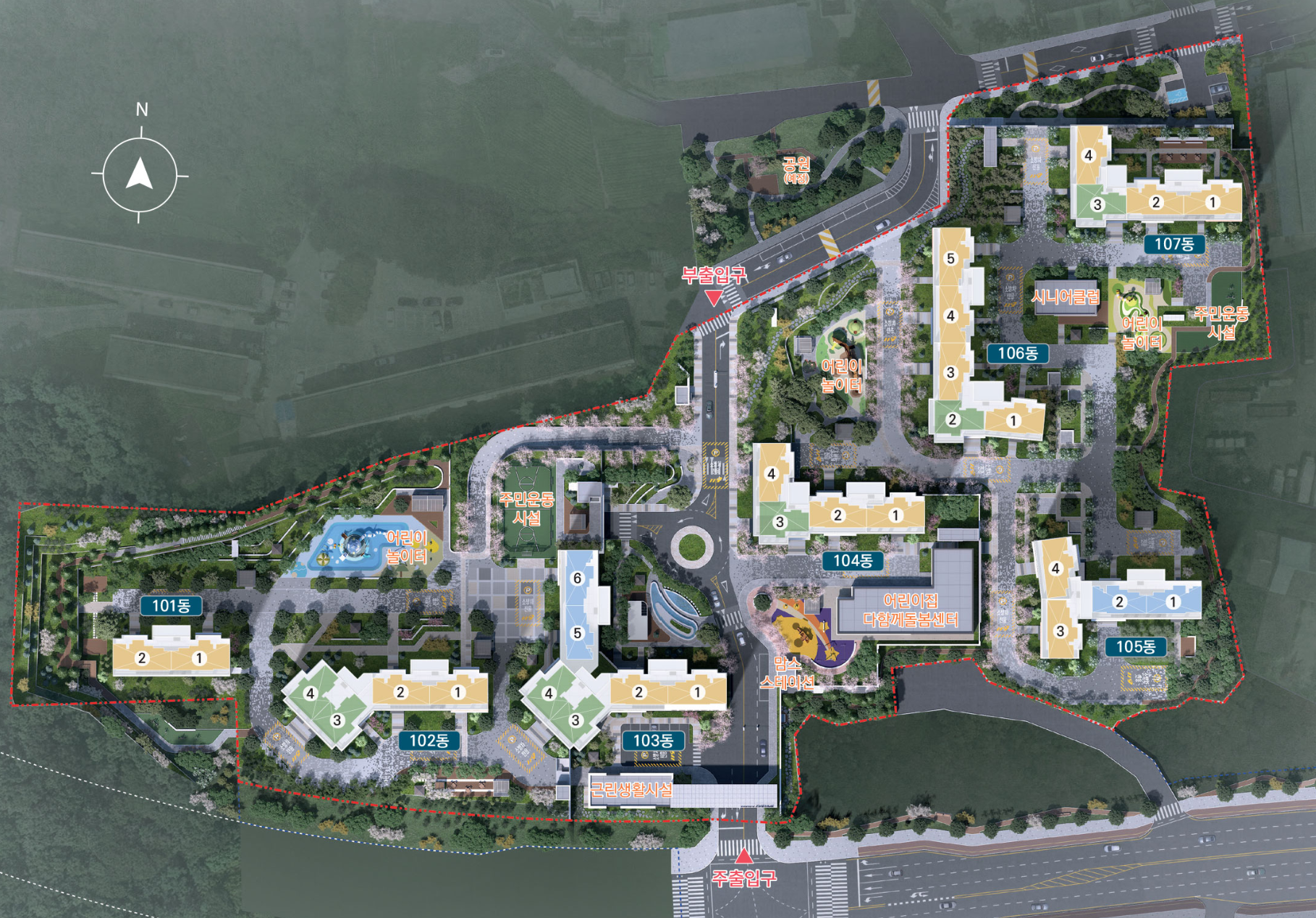 - 플레이놀이터, 그래피티월, 뷰벤치, 팀버카페, 힐링스퀘어, 빛의 숲 등 다양한 조경 특화 시설이 조성되어 입주민의 여가와 휴식을 지원합니다.