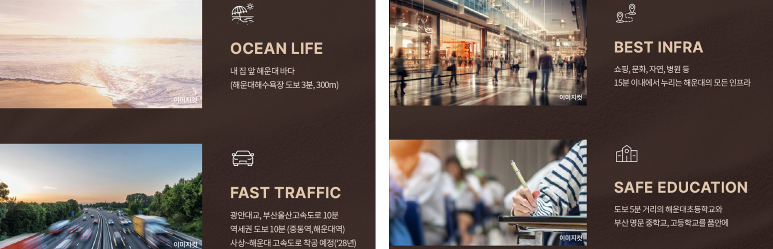 - 구남로 상권, CGV 해운대, 부산아쿠아리움, 해운대 시장, 홈플러스 해운대점 등 쇼핑과 문화, 여가 생활을 원스톱으로 누릴 수 있는 뛰어난 생활 인프라를 갖추고 있는 곳입니다.