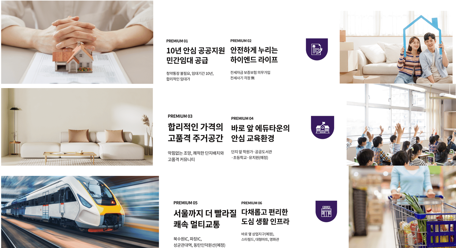 - 공공임대임에도 고품질설계를 적용하여 남향 위주 단지 배치, 4 베이 특화 평면으로 채광과 통풍을 극대화했으며 필로티 가든, 키즈룸, 맘스라운지, 북카페, 피트니스, 골프연습장 등 다양한 커뮤니티 시설 제공하여 프리미엄환경을 조성했습니다.