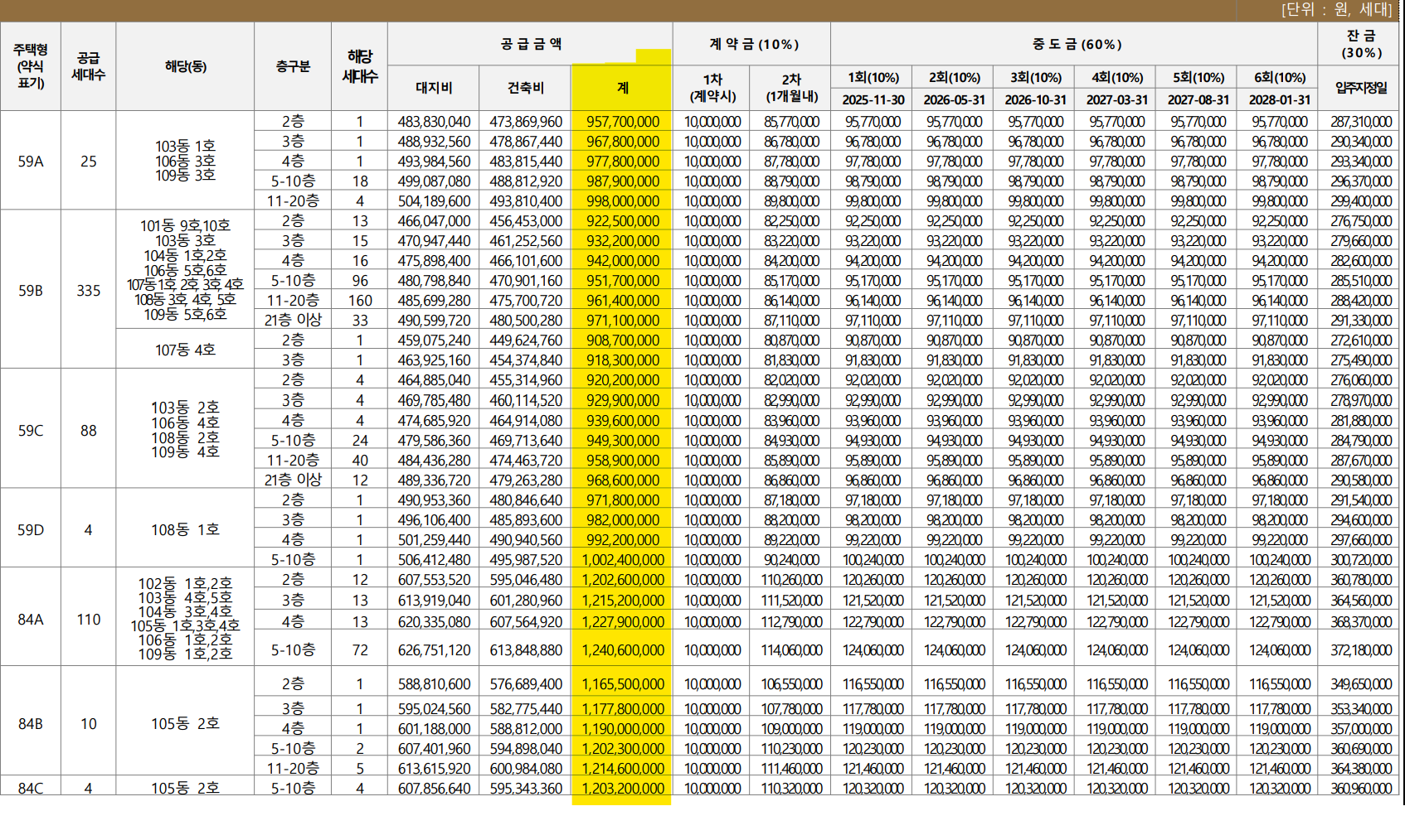 | 84ABC | 124 | 10억240만원 ~ 12억4060만원 |
