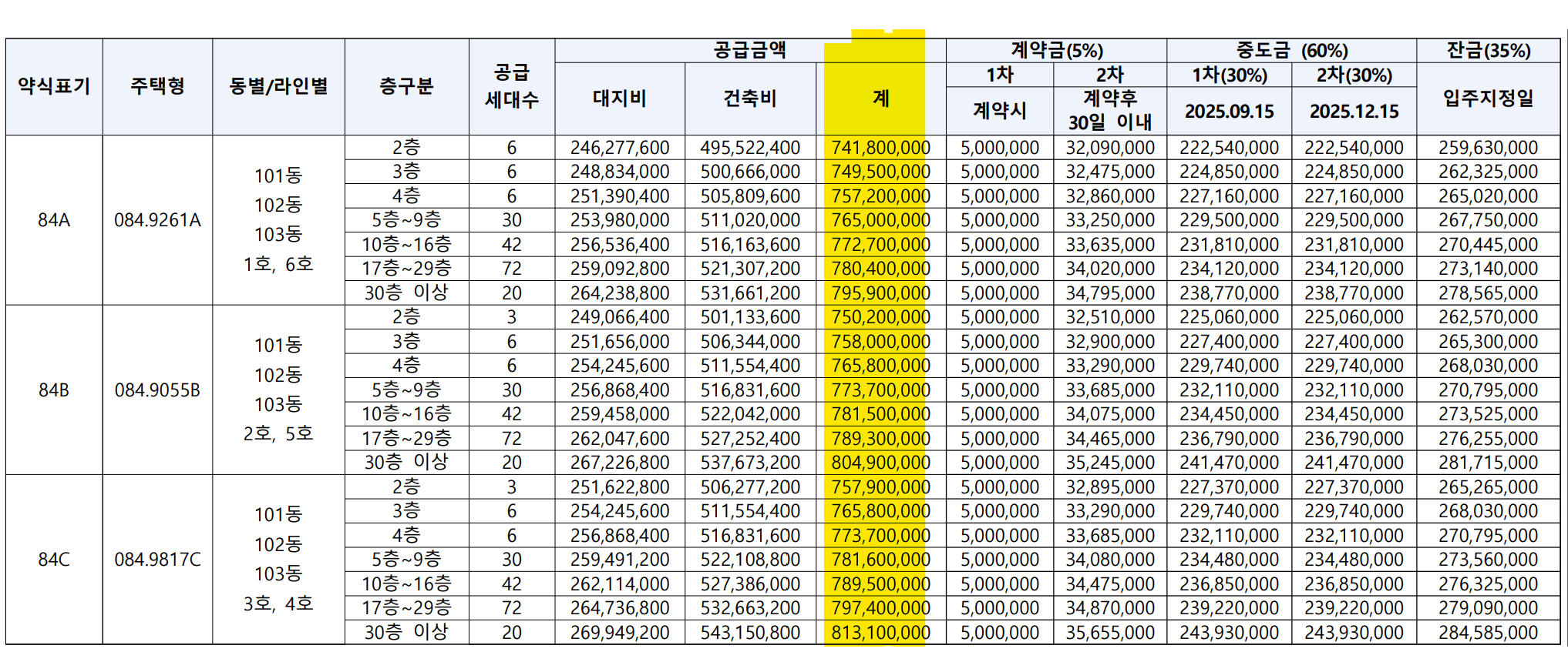 | 84C | 179 | 7억5790만원 ~ 8억1310만원 |
