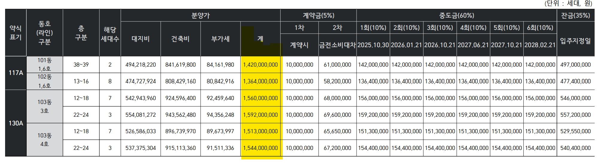 | 117A | 10 | 13억6400만원 ~ 14억2000만원 |
