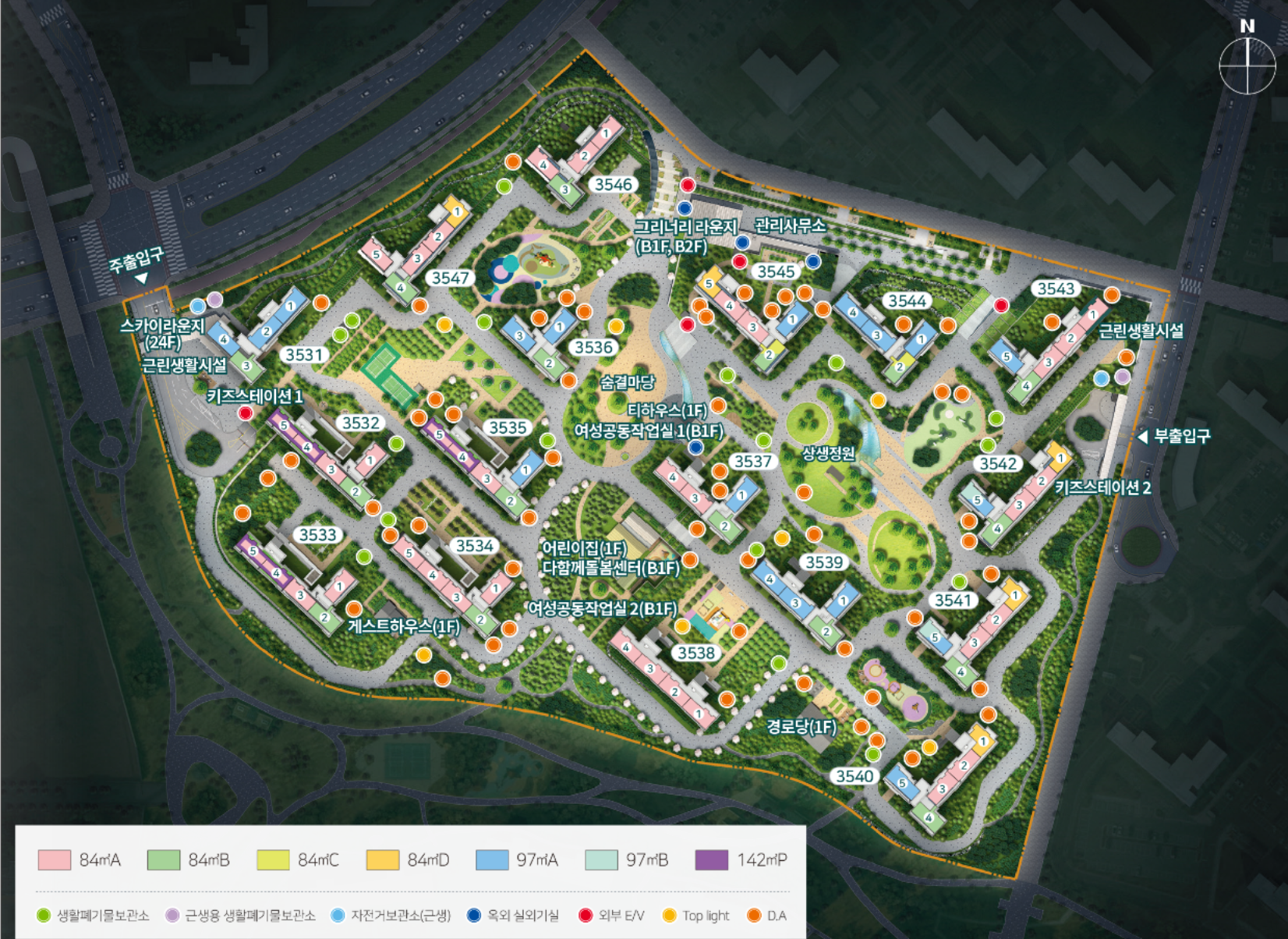 - 피트니스 센터, 골프연습장, 작은도서관(그리너리 스튜디오), 어린이집, 다 함께 돌봄 센터 등 다양한 운동 및 교육 시설이 마련되어 있습니다.
