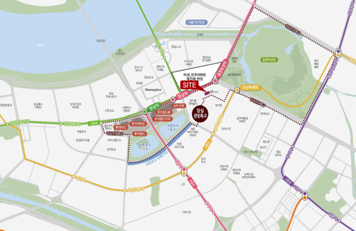 - 최적의 입지: 지하철 2호선 잠실역, 8호선 몽촌토성역, 9호선 한성백제역이 도보 거리 내에 위치해 있어 교통이 매우 편리합니다.